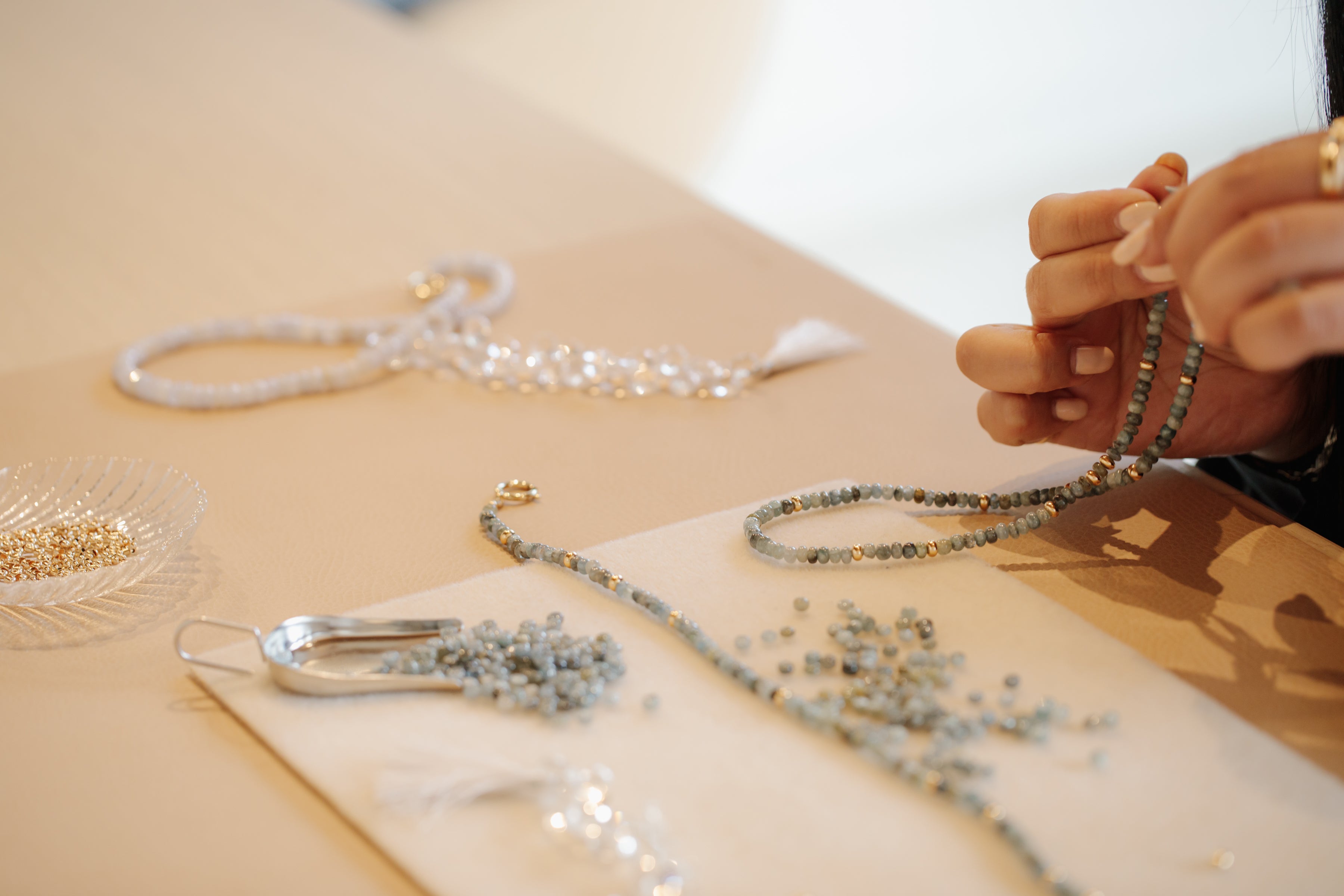 Each Leah Alexandra piece is thoughtfully designed and carefully assembled in our Vancouver studio. Our in-house production team hand-strings every beaded and pearl piece with precision, while select metal designs like cuff bracelets and rings are cut and shaped by hand, showcasing the artistry behind each collection. Other designs are thoughtfully sourced and curated from around the world, always meeting our high standards of quality and craftsmanship.