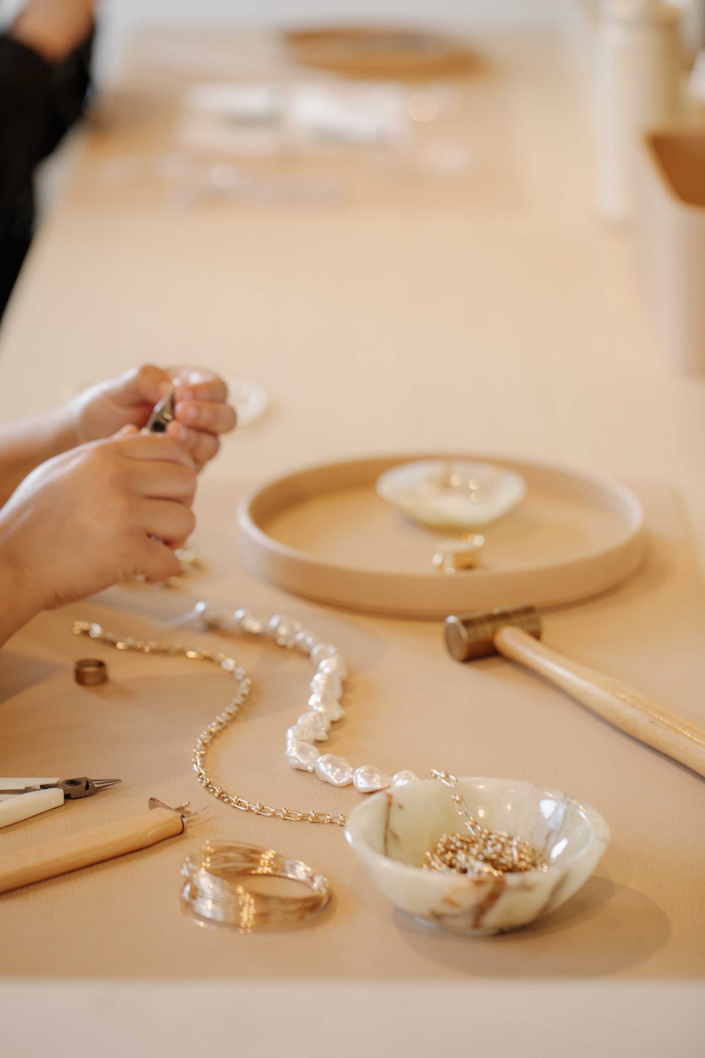 Every piece of Leah Alexandra Jewelry is designed, assembled, and finished by hand in our Vancouver studio. Our dedicated production team carefully strings and sets each stone and bead, ensuring the highest level of craftsmanship. From sketch to final polish, every detail is handled in-house with care and intention.
