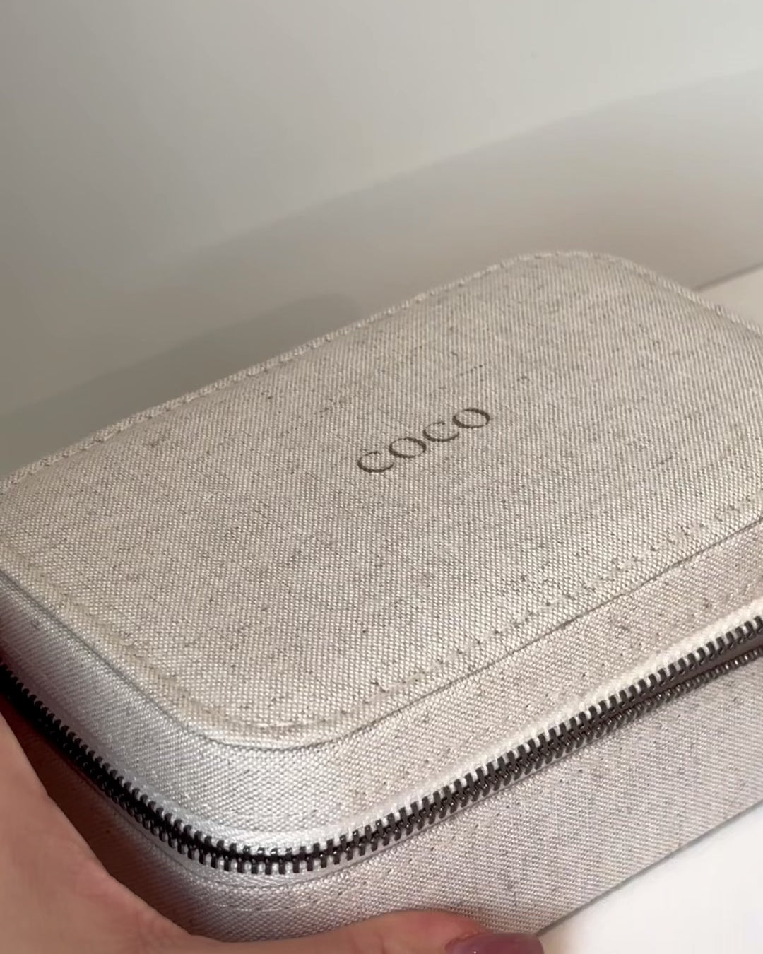 Meet your new favourite Jewelry Box, crafted with soft linen and luxurious satin interior. With a sleek zipper closure, this timeless jewelry box is designed to keep your most cherished pieces organized and safe, whether at home or abroad. Thoughtfully designed, it includes two deep pockets, an elasticized inside pocket, and a 15-piece ring compartment, so there is a perfect place for every jewel. Add a personal touch with a custom name or monogram engraving on top!